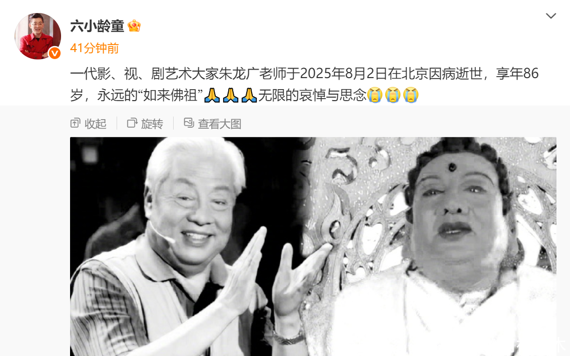 紧接着,曾搭档一起出演过《西游记》的演员六小龄童也发文悼念,称其是永远的“如来佛祖”,并表达无限的哀悼与思念。